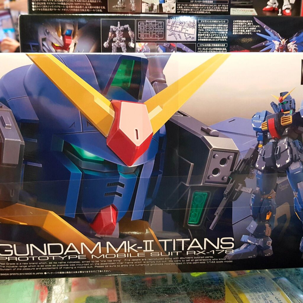 La gamme Real Grade, se veut être la gamme la plus aboutie à l’échelle 1/144, avec un niveau de détail identique voire supérieur à celui des Master Grade. Les RG proposent des kits ultra détaillés et très mobiles. Comme pour un MG, il n’y a quasiment aucun masquage à faire sur ces kits, les pièces étant toutes moulées dans la bonne couleur. Ce qui donnent parfois des pièces très très petites ! La contrepartie de cette qualité est une très grande fragilité des modèles.